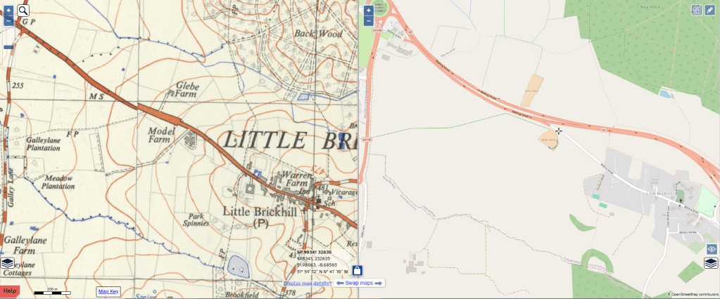 A look at the north end of Little Brickhill here, where the old alignment of Watling Street (the A5) meets the new dual carriageway bypass.