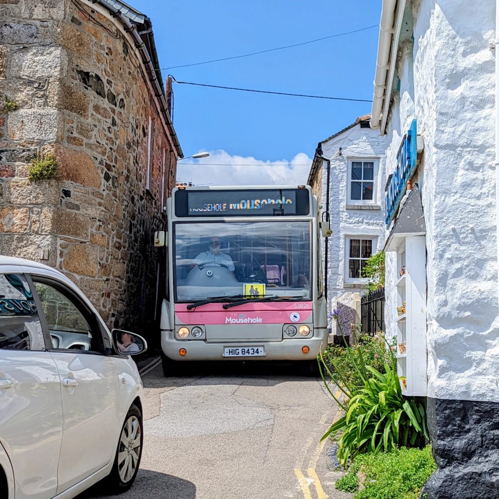 Until very recently, First ran a service all the way to the harbour in Mousehole, here an Optare Solo is seen squeezing through between buildings and cars on a sunny June day!