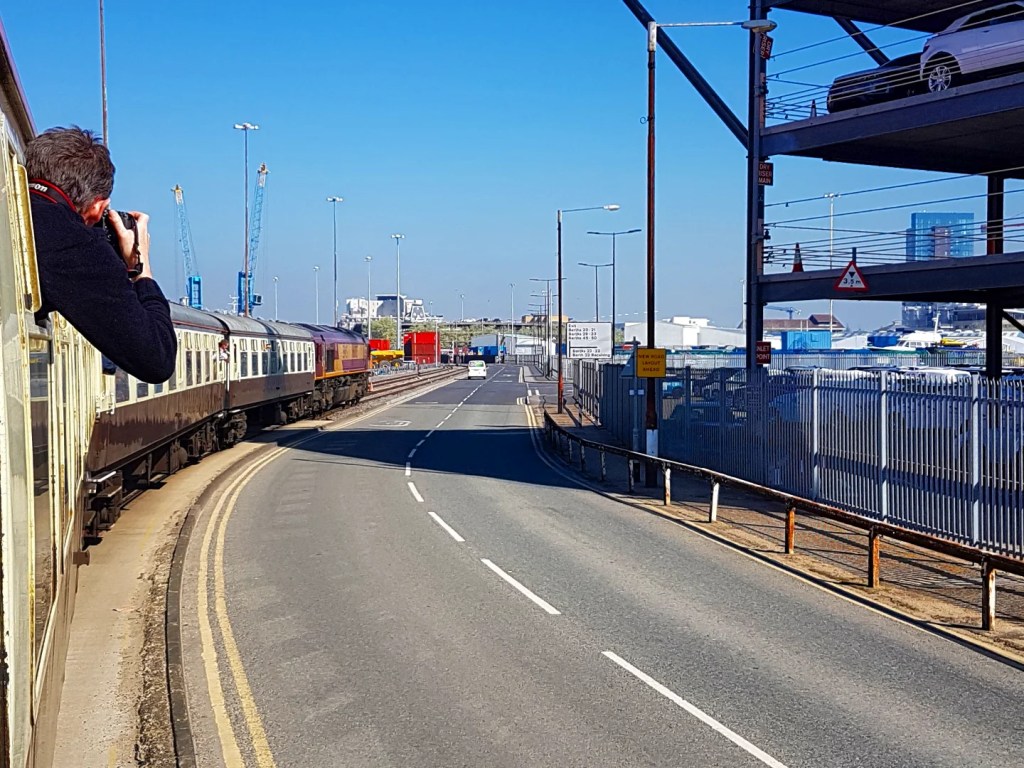 Here the Andover Fist railtour (the second attempt!) departs from Southampton QE2 Terminal alongside Test Road / Ocean Road inside the Port of Southampton complex.