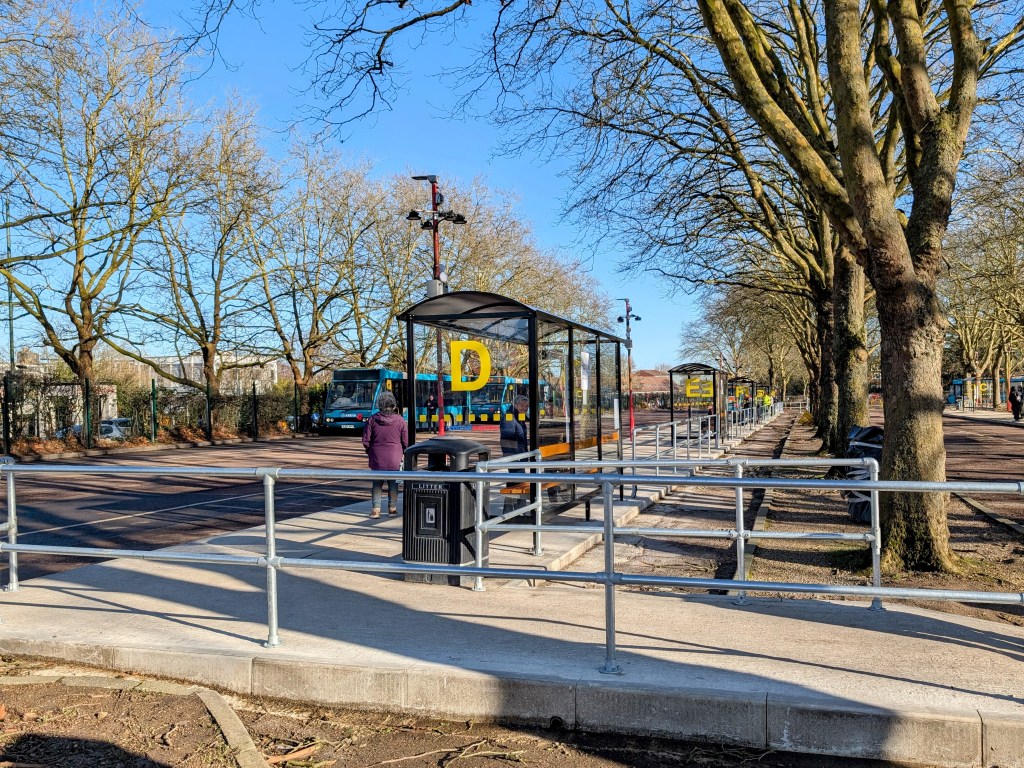 Last weekend I visited Harlow’s temporary bus station. It does not hide in any way the fact that the site was previously a car park. But in the sunny weather and with the tree-lined roads, it actually looks a lot nicer than the old one did!